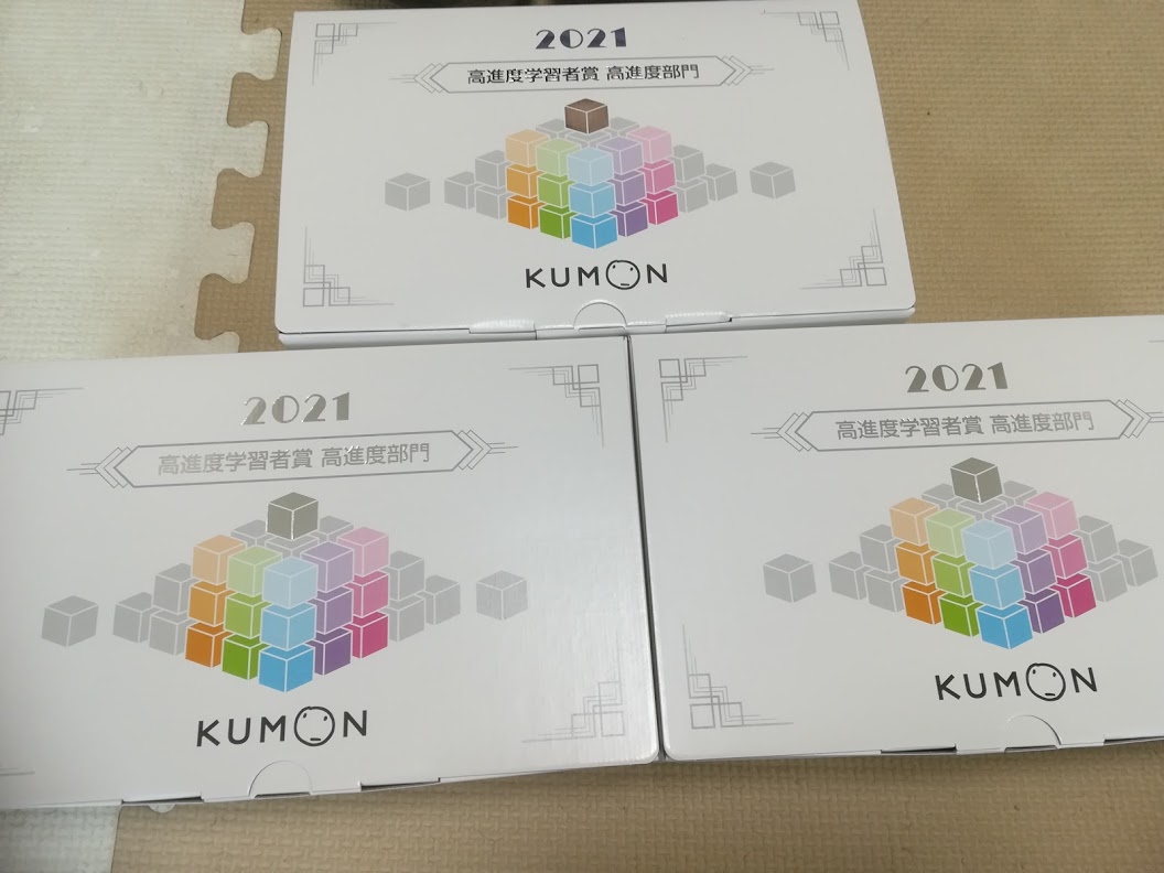 公文教室から2021年の高進度部門のオブジェをもらって帰りました 1年間よく頑張りました 子ども4人のドタバタ日記